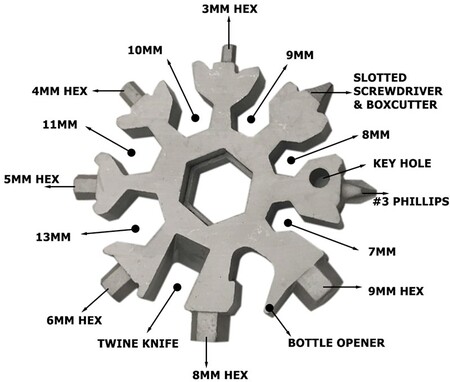 There are 18 different tools in one small, palm-sized snowflake! Including the regular Philips and flathead screwdriver, No. 3, 4, 5, 6, 7, 8 hex keys, and No. 6, 7, 8, 9, 10, 12, 14 wrenches, package opener, and a bottle opener!